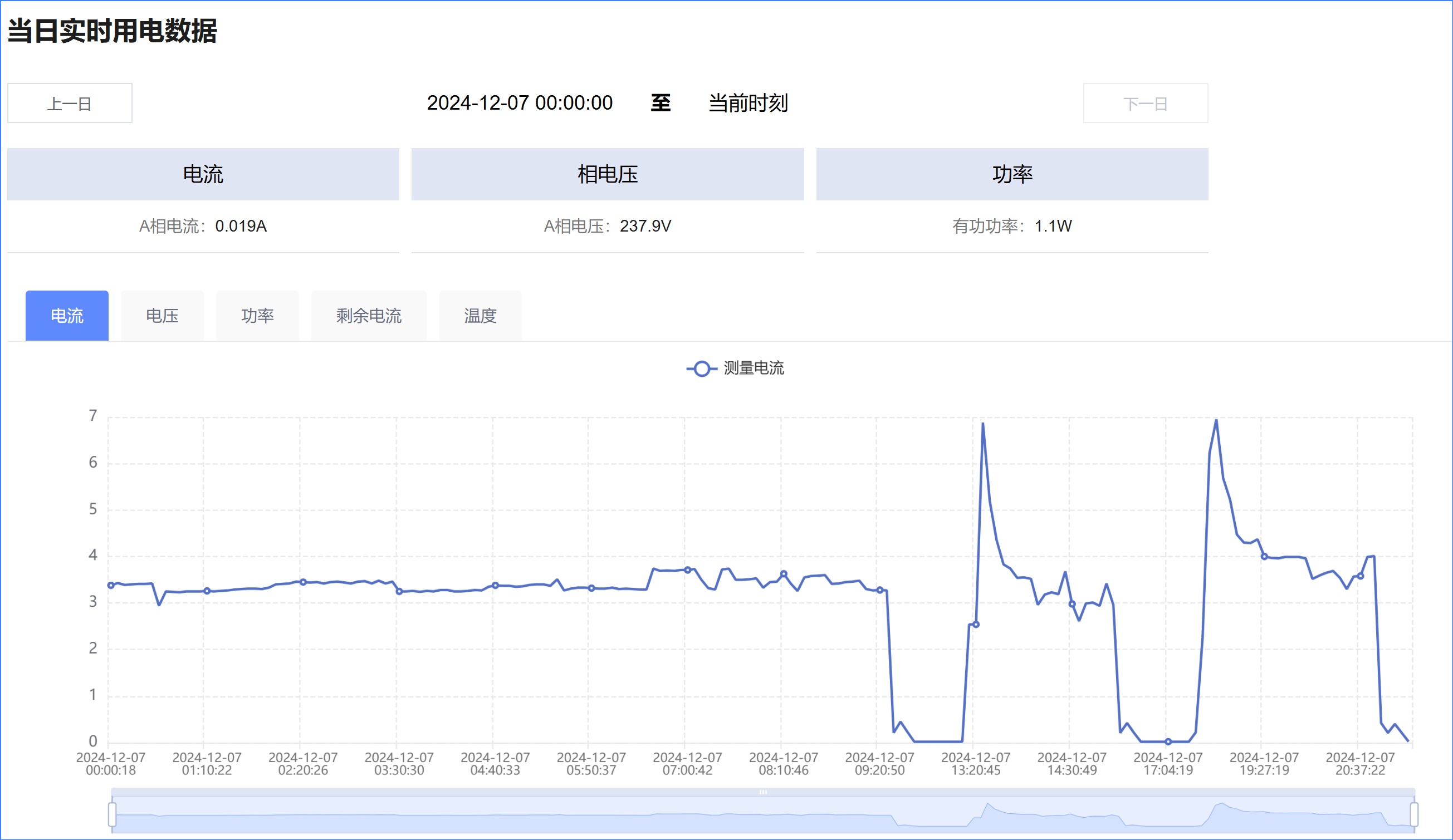 当日实时用电数据: 默认展示终端在当天00:00 起始的实时 电流、电压、功率等数据曲线。