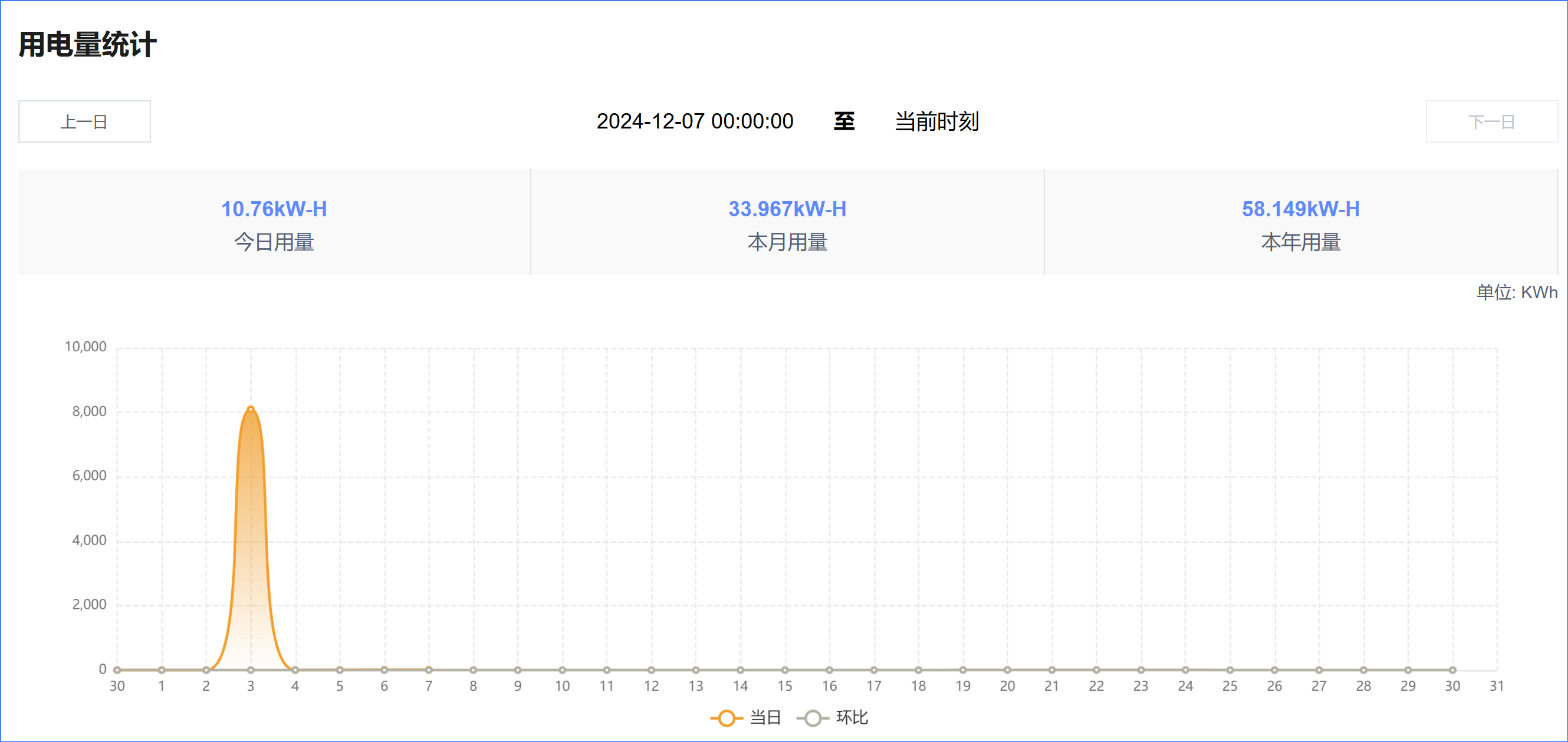 用电量统计 : 此模块将站点终端设备的历史用电量以图形方式呈现,其中集成了当日、当月、当年的用电统计。