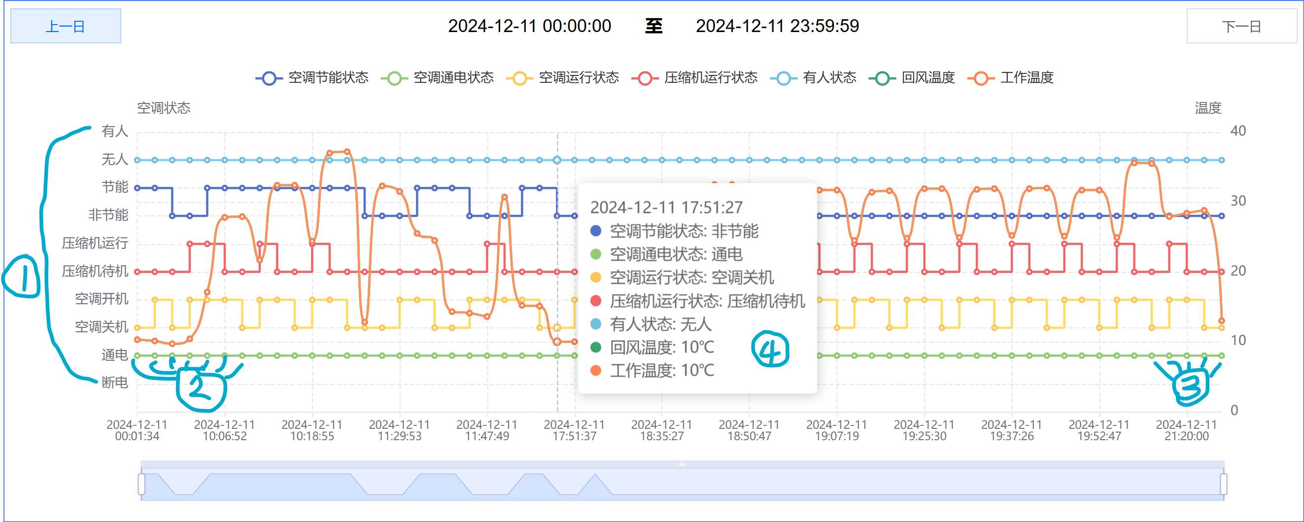 节能模式下,当发生 空调机通、断电,开、关机,压缩机启、停事件,上报一次室内温度曲线数据。