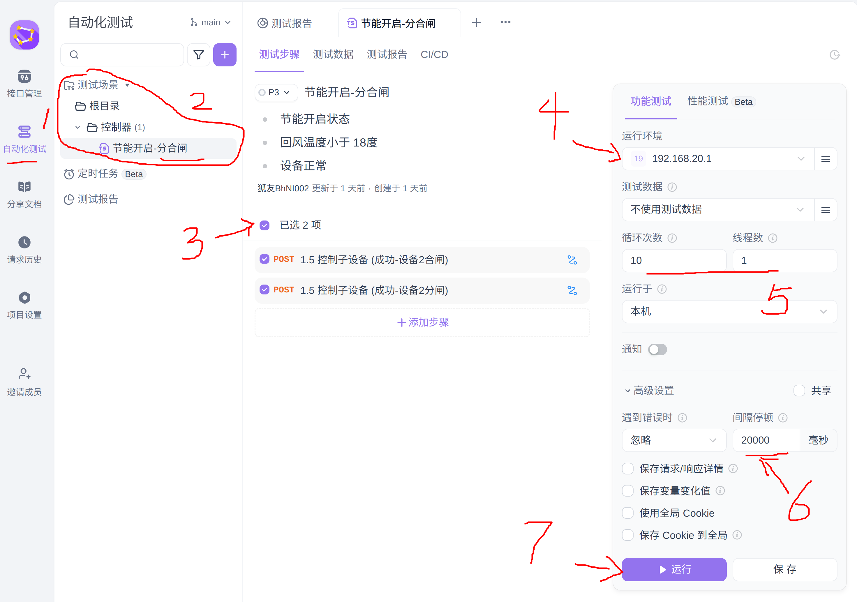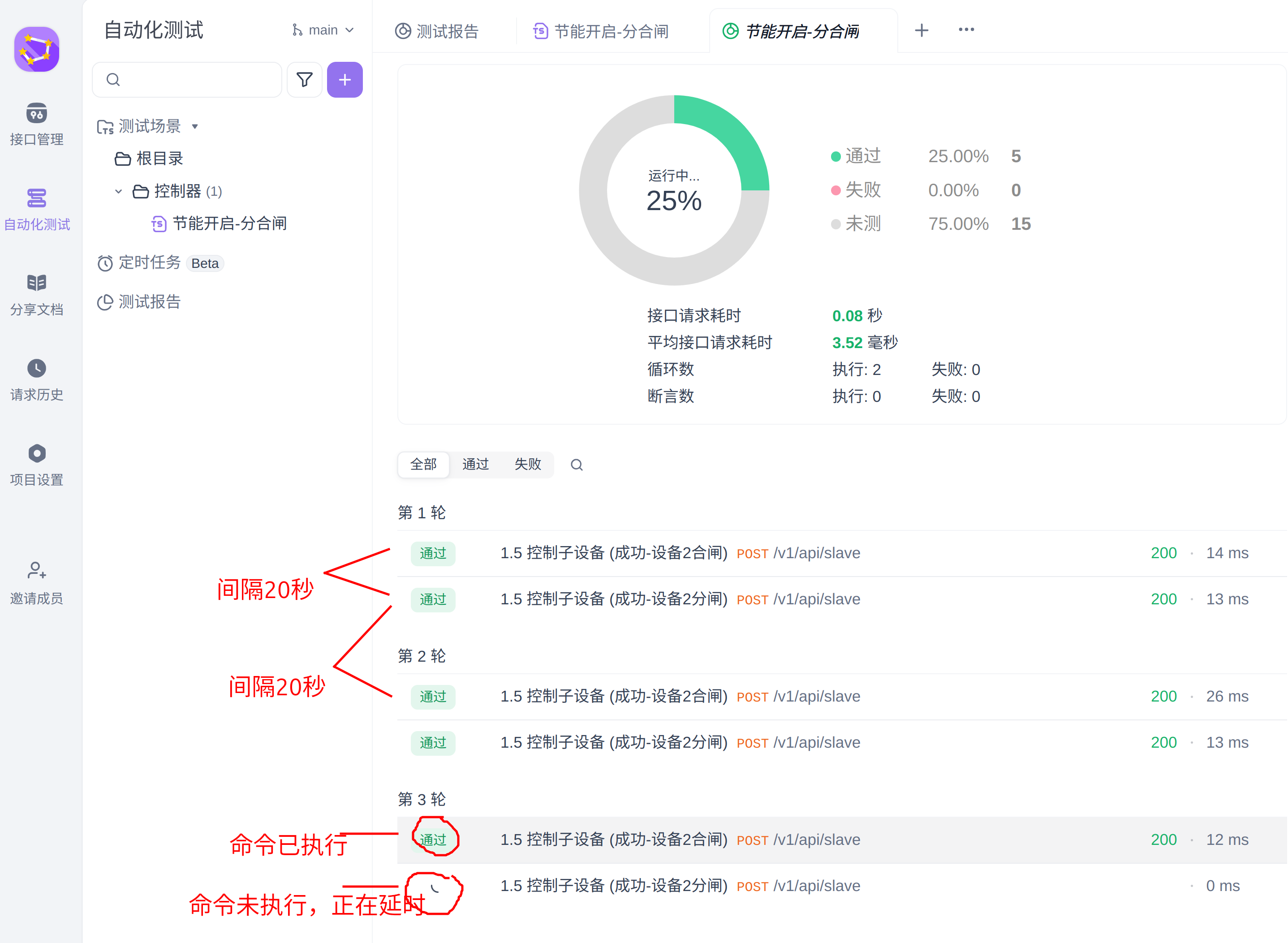如上图所示,测试用例执行过程是将选定的 http api 逐个执行。图中 api 共两条,当两条api全部执行完毕后,会再次开始循环执行 选中的两条 api,直到达到预设的10轮为止。 执行命令前会有20秒延时,延时过后立即执行。 图中显示的“通过”,仅代表控制指令发送到了控制器,不能代表采集器已经执行了命令。